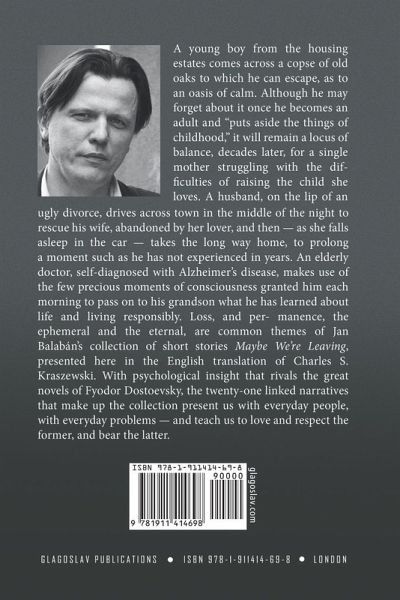 A young boy from the housing estates comes across a copse of old oaks to which he can escape, as to an oasis of calm. Although he may forget about it once he becomes an adult and "puts aside the things of childhood," it will remain a locus of balance, decades later, for a single mother struggling with the difficulties of raising the child she loves. A husband, on the lip of an ugly divorce, drives across town in the middle of the night to rescue his wife, abandoned by her lover, and then — as she falls asleep in the car — takes the long way home, to prolong a moment such as he has not experienced in years. An elderly doctor, self-diagnosed with Alzheimer’s disease, makes use of the few precious moments of consciousness granted him each morning to pass on to his grandson what he has learned about life and living responsibly. Loss, and permanence, the ephemeral and the eternal, are common themes of Jan Balabán’s collection of short stories Maybe We’re Leaving, presented here in the English translation of Charles S. Kraszewski. With psychological insight that rivals the great novels of Fyodor Dostoevsky, the twenty-one linked narratives that make up the collection present us with everyday people, with everyday problems — and teach us to love and respect the former, and bear the latter. Translation of this book was supported by the Ministry of Culture of the Czech Republic.