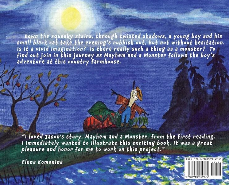 As with some children, procrastination gets the best of this young boy when his mother asks him to take the evening's rubbish out. When he sets out, just after dusk, to do as he's been asked, his vivid imagination and anxious anticipation, go into hyper mode by the sounds and happenings of the evening outdoors. Down the squeaky stairs, through twisted shadows, he makes his way to the burn can, but not without hesitation. His small black cat follows him from house to burn can, perhaps known, or unbeknownst to the boy. The closing darkness makes the creepy happenings even worse, and when his imagination continues to grow, he fears he will never make it to his destination. He is sure a monster is out there somewhere ready to get him, but is that true? As suspense builds, the tale of this boy and his black cat comes to a surprise climax. Is there really such a thing as a monsters? To find out join in this journey as Mayhem and a Monster follows the boy's adventure at this country farmhouse. "I loved Jason's story, Mayhem and a Monster from the first reading. I immediately wanted to illustrate this exciting book. It was a great pleasure and honor for me to work on this project." Elena Komonina