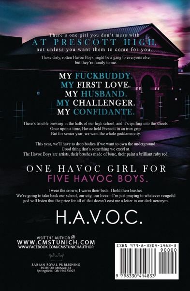 There's one girl you don't mess with at Prescott High, not unless you want them to come for you.Those dirty, rotten Havoc Boys might be a gang to everyone else, but they're family to me.My fuckbuddy. My first love. My husband. My challenger. My confidante. There's trouble brewing in the halls of our high school, and it's spilling into the streets.Once upon a time, Havoc held Prescott in an iron grip.But for senior year, we want the whole goddamn city. This year, we'll have to drop bodies if we want to own the underground.Good thing that's something we excel at.The Havoc Boys are artists, their brushes made of bone, their paint a brilliant ruby red. One Havoc Girl for five Havoc Boys.I wear the crown; I warm their beds; I hold their leashes.We're going to take back our school, our city, our lives-I'm just praying to whatever vengeful god will listen that the price for all of that doesn't cost me a letter in our dark acronym.H.A.V.O.C.