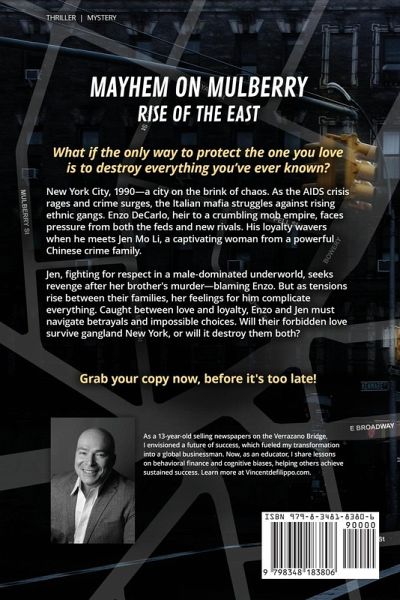 What if the only way to protect the one you love is to destroy everything you've ever known? "Mayhem on Mulberry is a fast-paced page-turner that readers will not soon forget, and that will appeal to fans of hard-boiled stories and more grounded crime novels alike." -Jo Niederhoff, San Francisco Book Review New York City, 1990-a city teetering on the brink of chaos. The AIDS pandemic is ravaging communities, crime is at an all-time high, and the streets pulse with the tension of gang warfare. The once-dominant Italian mafia, now in its twilight, faces a new threat: the rise of ruthless ethnic gangs determined to carve up their territory. Enzo DeCarlo, heir to a fading mob empire, is caught between two worlds. His father, the old-school Don Vincenzo, clings to the traditions of the past while the DeCarlo family crumbles under pressure from the feds and encroaching Chinese, Vietnamese, and Korean gangs. Enzo's loyalty to his family has always been unwavering-until he meets the captivating Jen Mo Li, a woman with secrets as dangerous as her beauty. Jen, the daughter of a powerful Chinese crime family, is no stranger to the brutal world of organized crime. Overlooked and undervalued by her own family, she fights to prove herself in a male-dominated world, growing colder and more ruthless with each passing day. But when her brother is murdered, and the blame falls on Enzo, Jen's desire for revenge spirals into something far more deadly-especially as her heart betrays her by falling for the enemy. With tensions between their families at a boiling point and betrayal lurking at every turn, Enzo and Jen's forbidden love becomes a ticking time bomb. When Jen takes control of the notorious Black Dragon gang, the violence escalates to all-out war in Chinatown, with blood flowing in the streets and power shifting hands. But Jen's bold moves come at a terrible cost, and when a tragic mistake links her to a human trafficking operation, she finds herself hunted by both the law and her enemies. As their worlds spiral out of control, Enzo and Jen are forced to make impossible choices. Can Enzo defy his father and the mafia's brutal code to save Jen and their child? And can Jen survive long enough to claim her throne in the criminal underworld-or will the betrayals she's suffered drive her to a darker fate? In this explosive tale of love, betrayal, and survival, nothing is certain, and no one is safe. Dive into the pulse-pounding world of gangland New York, where power, loyalty, and love collide. Will Enzo and Jen escape the deadly shadows of their families-or be consumed by them? The streets are unforgiving. Are you ready to find out who survives?