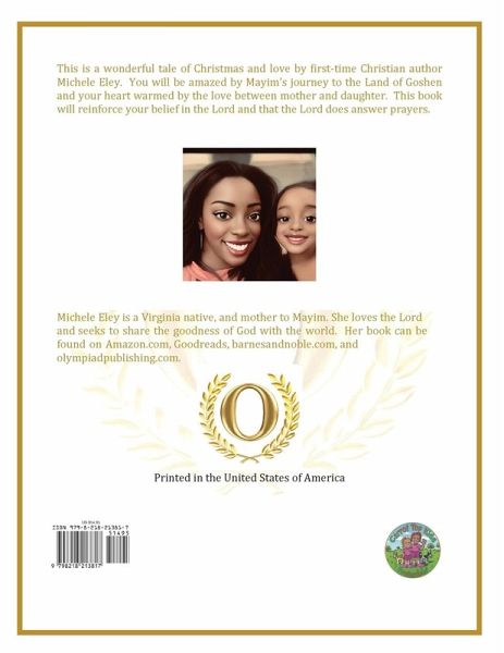 This is a wonderful tale of Christmas and love by first-time Christian author Michele Eley. You will be amazed by Mayim's journey to the Land of Goshen and your heart warmed by the love between mother and daughter. This book will reinforce your belief in the Lord and that the Lord does answer prayers.