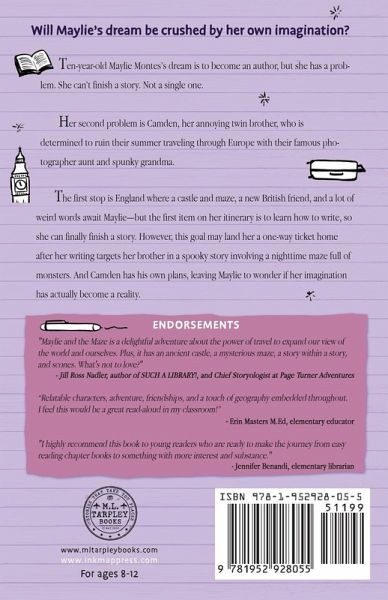 Will Maylie's dream be crushed by her own imagination? Ten-year-old Maylie Montes's dream is to become an author, but she has a problem. She can't finish a story. Not a single one. Her second problem is Camden, her annoying twin brother, who is determined to ruin their summer traveling through Europe with their famous photographer aunt and spunky grandma. The first stop is England where a castle and maze, a new British friend, and a lot of weird words await Maylie-but the first item on her itinerary is to learn how to write, so she can finally finish a story. However, this goal may land her a one-way ticket home after her writing targets her brother in a spooky story involving a nighttime maze full of monsters. And Camden has his own plans, leaving Maylie to wonder if her imagination has actually become a reality.