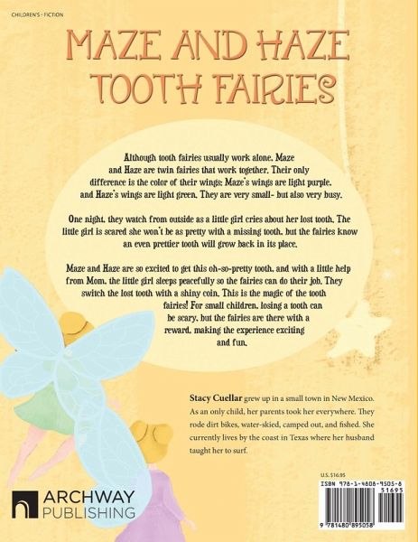 Although tooth fairies usually work alone, Maze and Haze are twin fairies that work together. Their only difference is the color of their wings: Maze's wings are light purple, and Haze's wings are light green. They are very small-but also very busy. One night, they watch from outside as a little girl cries about her lost tooth. The little girl is scared she won't be as pretty with a missing tooth, but the fairies know an even prettier tooth will grow back in its place. Maze and Haze are so excited to get this oh-so-pretty tooth, and with a little help from Mom, the little girl sleeps peacefully so the fairies can do their job. They switch the lost tooth with a shiny coin. This is the magic of the tooth fairies! For small children, losing a tooth can be scary, but the fairies are there with a reward, making the experience exciting and fun.