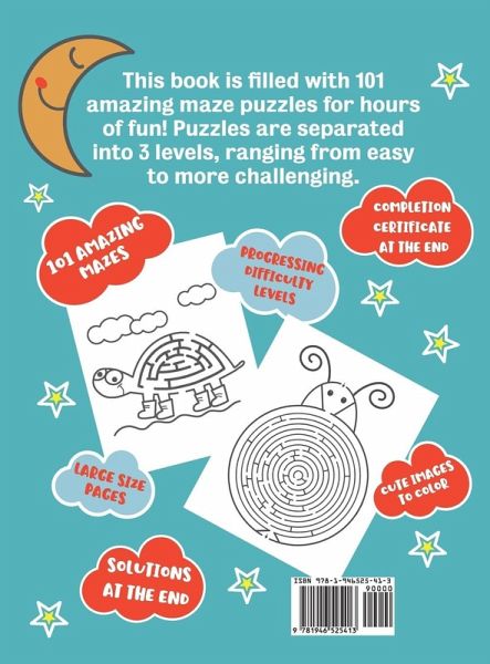 Give your child an aMAZEing experience with this maze activity book! A complete maze experience with: ¿101 Mazes with colorable characters and illustrations ¿101 Fun themes make solving mazes exciting ¿ Increasing difficulty levels ¿ With real world logic: Bring the chicken home, help the family get to the bus, help the dog get to the bone and more. ¿ Improve hand eye coordination, dexterity and muscle memory ¿ With certificate at back of the book! The amazingly fun mazes and activities in this book are designed to provide an enjoyable and fun learning experience for children of all ages from preschool, nursery and even beyond. Solving maze activities can be a crucial yet fun part of your kid's development, they help in nurturing the development of your child's brain, thought processes, problem solving skills, IQ and intelligence by having your child map out the best path to reach the goal in every activity. Constant practice helps nurture the mind and build hand eye coordination, problem solving skills, muscle memory and dexterity. Each maze is lovingly designed with cute characters and illustrations that your child can color in that are sure to keep your kid engaged. Mazes have increasing difficulty to get your child easily started off with the logic of maze solving and progressing to more challenging mazes as your child gets more experience.Real world logic is incorporated in the mazes, examples are: help chicken to the coop and bring the ball to the hoop. Real world logic helps anchor the activities to real life situations and can be experience for your child.