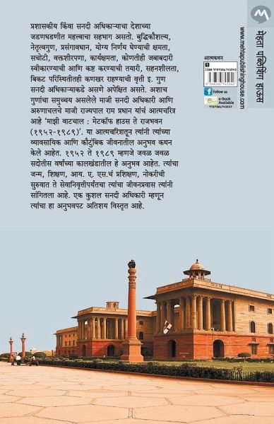 MAZI VATCHAL: METCALFE HOUSE TE RAJBHAVAN: (1952-1989):THE EX-ADMINISTRATIVE OFFICER AND THE EX-GOVERNOR OF ARUNACHAL PRADESH, MR. RAM PRADHAN, PORTRAYS HIS CAREER FOR THE READERS. THIS IS AN ACCOUNT OF HIS JOURNEY THROUGHOUT. BORN IN DADAR, MUMBAI, ON 27TH JUNE 1928, MR. PRADHAN HAD A COMFORTABLE CHILDHOOD IN MUMBAI. HIS FATHER WAS A CLERK IN MILITARY ACCOUNTS DEPARTMENT. HIS MOTHER WAS FROM NAGOTHANE. LATER, HIS FATHER WAS PROMOTED AS A SUPERINTENDENT AND WAS TRANSFERRED TO DELHI. THEREAFTER, THE FATHER WAS TRANSFERRED TO PUNE AS AN ASSISTANT ACCOUNT GENERAL. RAM'S SCHOOLING WAS COMPLETED IN NEW ENGLISH SCHOOL. HE SOUGHT DEGREE IN ARTS WITH MATHS AS HIS SPECIALIZATION FROM THE FERGUSSON COLLEGE. WITH NEW DREAMS AND AIMS, HE JOINED MUMBAI UNIVERSITY. HE ENROLLED FOR M.A., STATISTICS. MEANWHILE, HIS MOTHER BECAME SERIOUS AND PASSED AWAY. HE HAD TO LIVE HIS EDUCATION HALF WAY. HE JOINED GOKHALE INSTITUTION FOR POLITICAL SCIENCE AND ECONOMICS. HE PARTICIPATED IN THE NATIONAL SAMPLE SURVEY CONDUCTED BY THE SAME. MEANWHILE, HE DECIDED TO APPEAR FOR THE COMPETITIVE EXAMS. AS HE SUCCESSFULLY COMPLETED THE I. C. S. HE WAS ADMITTED TO THE METCALFE HOUSE. THERE WAS NO TURNING BACK NOW. THIS BOOK REVEALS HIS JOURNEY. AS A PART OF TRAINING, MANY EMINENT PERSONALITIES WOULD OFTEN VISIT THE I. C. S. TRAINEE OFFICERS. THE LECTURES DELIVERED BY THEM WERE TREASURE HOUSES OF WISDOM. VISITING NEARBY VILLAGES AND PLACES HELPED THE TRAINEES TO LEARN MORE ABOUT THE DAY-TO-DAY LIFE OF CIVILIANS AND THE CHALLENGES AND PROBLEMS ACCOMPANIED. APART FROM THIS, THERE WERE MANY THINGS LEARNT AND UNDERSTOOD DURING THIS PERIOD. MR. PRADHAN ELABORATES THEM FOR THE READERS. A STAY WITH THE MILITARY UNITS WAS QUITE MEMORABLE FOR HIM. IT WAS ALSO A PART OF THE TRAINING. HIS LIFE WAS ONCE AT STAKE DURING THIS TRAINING. HE ROAMED THROUGHOUT THE COUNTRY DURING THIS TRAINING. AT THE END OF IT, HE PARTICIPATED IN THE FLAG HOISTING CEREMONY ON 15TH AUGUST AND THE PARADE ON 26TH JANUARY. THIS PRESENTED HIM WITH THE OPPORTUNITY OF BEING IN THE COMPANY OF MILITARY OFFICERS FROM NAVY, ARMY AND AIR FORCE AS WELL. HE ALSO TOOK THE DECISION OF TYING THE KNOT WITH THE GADKARI'S DAUGHTER. THIS MEMOIR INCLUDES SOME LETTERS WRITTEN BY HIM TO HIS FATHER AND BROTHERS. HIS FIRST POSTING WAS IN MUMBAI WHERE HE JOINED THE STATE GOVERNMENT. HE MET MANY EMINENT PERSONALITIES, LEADERS AND HIGH-RANKING OFFICERS. LATER, HE TOOK CHARGE AT AHMEDABAD AS THE COLLECTOR. THE VARIOUS EXPERIENCE GIVE US A GLIMPSE OF HIS TENURE THERE. AT EVERY PLACE THAT HE WAS TRANSFERRED TO, HE WAS ABLE TO ESTABLISH GOOD RELATIONS AND GAIN RESPECT. HE WAS ABLE TO TRAVEL TO THE INTERIOR PARTS WHERE HIS WIFE ALWAYS ACCOMPANIED HIM. LIFE WAS ENRICHED WITH MORE EXPERIENCES. '¿¿¿¿ ¿¿¿¿¿¿ : ¿¿¿¿¿¿ ¿¿¿¿ ¿¿ ¿¿¿¿¿¿ (¿¿¿¿ - ¿¿¿¿)' ¿¿ ¿¿¿¿ ¿¿¿¿ ¿¿¿¿¿¿¿ ¿¿¿ ¿¿¿¿¿¿¿¿¿ ¿¿¿¿ ¿¿¿¿¿¿¿¿ ¿¿¿ ¿¿¿¿¿¿ ¿¿¿¿¿ ¿¿¿¿¿¿¿¿¿¿ ¿¿¿. ¿¿ ¿¿¿¿¿¿¿¿¿¿¿¿¿¿ ¿¿¿¿¿¿¿ ¿¿¿¿¿¿¿¿¿ ¿¿¿¿¿¿¿¿¿¿ ¿¿¿ ¿¿¿¿¿¿¿¿ ¿¿¿¿¿¿¿¿¿ ¿¿¿¿¿ ¿¿¿¿¿ ¿¿¿. ¿¿¿¿¿¿ ¿¿¿¿¿ ¿¿¿¿ ¿¿ ¿¿¿ ¿¿¿¿ ¿¿¿¿ ¿¿¿¿¿¿ ¿¿¿¿ ¿¿¿¿ ¿¿¿¿. ¿¿¿¿¿¿¿ ¿¿¿¿ ¿¿¿¿¿¿¿¿¿¿ ¿¿¿¿¿¿¿ ¿¿¿¿¿¿¿¿¿¿¿¿¿¿ ¿¿¿¿¿¿¿Â ¿¿¿¿. ¿¿¿¿¿¿¿ ¿¿¿¿ ¿¿¿¿¿¿¿¿ ¿¿¿¿ ¿¿¿¿. ¿¿¿ ¿¿¿¿¿¿ ¿¿¿¿¿ ¿¿¿¿¿¿¿¿ ¿¿¿¿¿, ¿¿¿¿¿¿¿¿ ¿¿¿¿¿¿¿¿¿ ¿¿¿¿¿¿¿¿ ¿¿¿¿¿¿¿¿¿¿¿¿¿ ¿¿¿¿¿ ¿¿¿¿ ¿¿¿¿¿ ¿¿¿¿¿¿¿