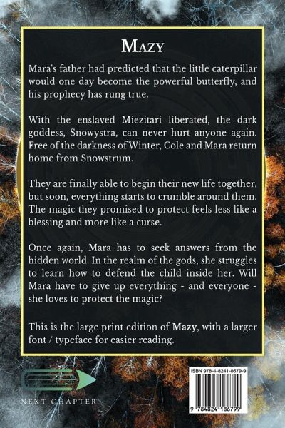 Mara's father had predicted that the little caterpillar would one day become the powerful butterfly, and his prophecy has rung true. With the enslaved Miezitari liberated, the dark goddess, Snowystra, can never hurt anyone again. Free of the darkness of Winter, Cole and Mara return home from Snowstrum. They are finally able to begin their new life together, but soon, everything starts to crumble around them. The magic they promised to protect feels less like a blessing and more like a curse. Once again, Mara has to seek answers from the hidden world. In the realm of the gods, she struggles to learn how to defend the child inside her. Will Mara have to give up everything - and everyone - she loves to protect the magic? This is the large print edition of Mazy, with a larger font / typeface for easier reading.