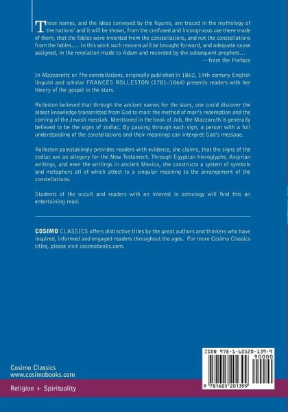 In Mazzaroth; or The constellations, originally published in 1862, 19th-century English linguist and scholar FRANCES ROLLESTON (1781-1864) presents readers with her theory of the gospel in the stars. Rolleston believed that through the ancient names for the stars, one could discover the oldest knowledge transmitted from God to man: the method of man's redemption and the coming of the Jewish messiah. Mentioned in the book of Job, the Mazzaroth is generally believed to be the signs of zodiac. By passing through each sign, a person with a full understanding of the constellations and their meanings can interpret God's message. Rolleston painstakingly provides readers with evidence, she claims, that the signs of the zodiac are an allegory for the New Testament. Through Egyptian hieroglyphs, Assyrian writings, and even the writings in ancient Mexico, she constructs a system of symbols and metaphors all of which attest to a singular meaning to the arrangement of the constellations. Students of the occult and readers with an interest in astrology will find this an entertaining read.