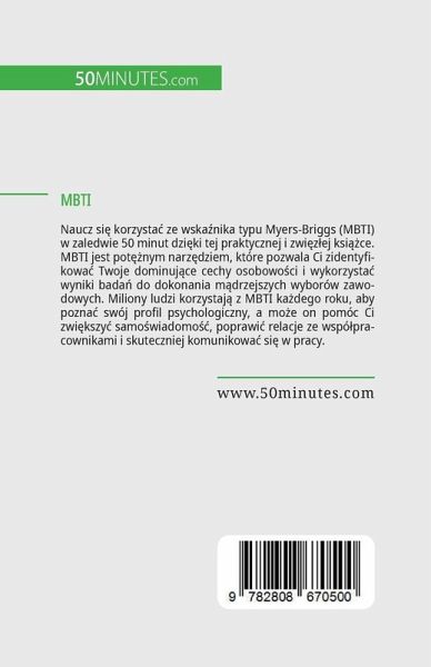 Naucz si¿ korzystä ze wskänika typu Myers-Briggs (MBTI) w zaledwie 50 minut dzi¿ki tej praktycznej i zwi¿z¿ej ksi¿¿ce. MBTI jest pot¿¿nym narz¿dziem, które pozwala Ci zidentyfikowä Twoje dominuj¿ce cechy osobowo¿ci i wykorzystä wyniki badä do dokonania m¿drzejszych wyborów zawodowych. Miliony ludzi korzystaj¿ z MBTI kädego roku, aby poznä swój profil psychologiczny, a mo¿e on pomóc Ci zwi¿kszy¿ samo¿wiadomo¿¿, poprawi¿ relacje ze wspó¿pracownikami i skuteczniej komunikowä si¿ w pracy. W tej ksi¿¿ce poznasz zastosowania MBTI w rozwoju osobistym, zasobach ludzkich, przywództwie i organizacji. Zawiera równie¿ krótki przegl¿d 16 profili instrumentu, omówienie praktycznych zastosowä oraz porady dotycz¿ce interpretacji wyników, daj¿c Ci wszystko, czego potrzebujesz, aby zrozumie¿ swój typ osobowo¿ci i zastosowä wyniki badä do swojej sytuacji.