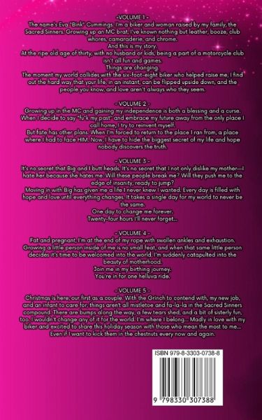 - VOLUME 1 - The name's Eva "Bink" Cummings. I'm a biker and woman raised by my family, the Sacred Sinners. Growing up an MC brat, I've known nothing but leather, booze, club whores, camaraderie, and chrome. And this is my story. At the ripe old age of thirty, with no husband or kids, being a part of a motorcycle club isn't all fun and games. Things are changing. The moment my world collides with the six-foot-eight biker who helped raise me, I find out the hard way that your life, in an instant, can be flipped upside down, and the people you know and love aren't always who they seem. - VOLUME 2 - Growing up in the MC and gaining my independence is both a blessing and a curse. When I decide to say "fu*k my past" and embrace my future away from the only place I call home, I try to reinvent myself. But fate has other plans. When I'm forced to return to the place I ran from, a place where I had to face HIM. Now, I have to hide the biggest secret of my life and hope nobody discovers the truth. - VOLUME 3 - It's no secret that Big and I butt heads. It's no secret that I not only dislike my mother-I hate her because she hates me. Will these people break me? Will they push me to the edge of insanity, ready to jump? Moving in with Big has given me a life I never knew I wanted. Every day is filled with hope and love until everything changes. It takes a single day for my world to never be the same. One day to change me forever. Twenty-four hours I'll never forget... - VOLUME 4 - Fat and pregnant, I'm at the end of my rope with swollen ankles and exhaustion. Growing a little person inside of me is no small feat, and when that same little person decides it's time to be welcomed into the world, I'm suddenly catapulted into the beauty of motherhood. Join me in my birthing journey. You're in for one helluva ride. - VOLUME 5 - Christmas is here, our first as a couple. With the Grinch to contend with, my new job, and an infant to care for, things aren't all mistletoe and fa-la-la in the Sacred Sinners compound. There are bumps along the way, a few tears shed, and a bit of sisterly fun, too. I wouldn't change any of it for the world. I'm where I belong... Madly in love with my biker and excited to share this holiday season with those who mean the most to me... Even if I want to kick them in the chestnuts every now and again.