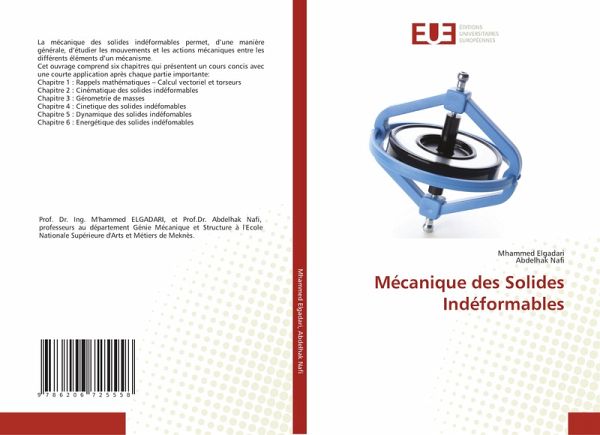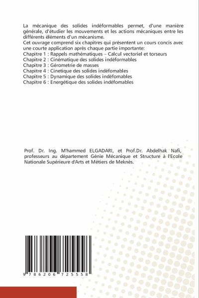La mécanique des solides indéformables permet, d'une manière générale, d'étudier les mouvements et les actions mécaniques entre les différents éléments d'un mécanisme. Cet ouvrage comprend six chapitres qui présentent un cours concis avec une courte application après chaque partie importante:Chapitre 1 : Rappels mathématiques - Calcul vectoriel et torseurs Chapitre 2 : Cinématique des solides indéformablesChapitre 3 : Gérometrie de massesChapitre 4 : Cinetique des solides indéfomablesChapitre 5 : Dynamique des solides indéfomablesChapitre 6 : Energétique des solides indéfomables