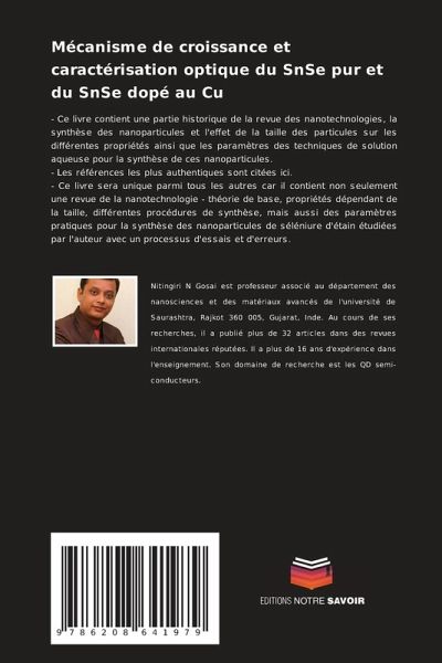 - Ce livre contient une partie historique de la revue des nanotechnologies, la synthèse des nanoparticules et l'effet de la taille des particules sur les différentes propriétés ainsi que les paramètres des techniques de solution aqueuse pour la synthèse de ces nanoparticules. - Les références les plus authentiques sont citées ici. - Ce livre sera unique parmi tous les autres car il contient non seulement une revue de la nanotechnologie - théorie de base, propriétés dépendant de la taille, différentes procédures de synthèse, mais aussi des paramètres pratiques pour la synthèse des nanoparticules de séléniure d'étain étudiées par l'auteur avec un processus d'essais et d'erreurs.
