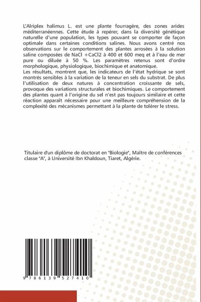 L'Alriplex halimus L. est une plante fourragère, des zones arides méditerranéennes. Cette étude à repérer, dans la diversité génétique naturelle d'une population, les types pouvant se comporter de façon optimale dans certaines conditions salines. Nous avons centré nos observations sur le comportement des plantes arrosées à la solution saline composées de NaCl +CaCl2 à 400 et 600 meq et à l'eau de mer pure ou diluée à 50 %. Les paramètres retenus sont d'ordre morphologique, physiologique, biochimique et anatomique. Les résultats, montrent que, les indicateurs de l'état hydrique se sont montrés sensibles à la variation de la teneur en sels du substrat. De plus l'utilisation de deux natures à concentration croissante de sels, provoque des variations structurales et biochimiques. Le comportement des plantes quant à l'origine du sel n'est pas toujours similaire et cette réaction apparaît nécessaire pour une meilleure compréhension de la complexité des mécanismes permettant à la plante de tolérer le stress.