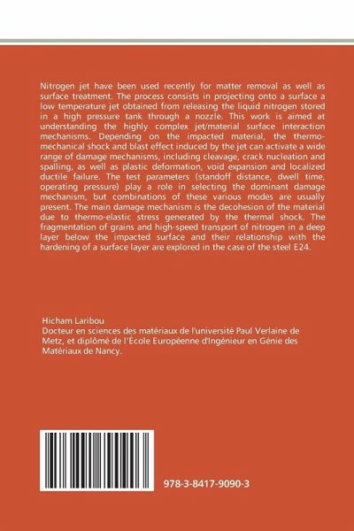 Nitrogen jet have been used recently for matter removal as well as surface treatment. The process consists in projecting onto a surface a low temperature jet obtained from releasing the liquid nitrogen stored in a high pressure tank through a nozzle. This work is aimed at understanding the highly complex jet/material surface interaction mechanisms. Depending on the impacted material, the thermo-mechanical shock and blast effect induced by the jet can activate a wide range of damage mechanisms, including cleavage, crack nucleation and spalling, as well as plastic deformation, void expansion and localized ductile failure. The test parameters (standoff distance, dwell time, operating pressure) play a role in selecting the dominant damage mechanism, but combinations of these various modes are usually present. The main damage mechanism is the decohesion of the material due to thermo-elastic stress generated by the thermal shock. The fragmentation of grains and high-speed transport of nitrogen in a deep layer below the impacted surface and their relationship with the hardening of a surface layer are explored in the case of the steel E24.