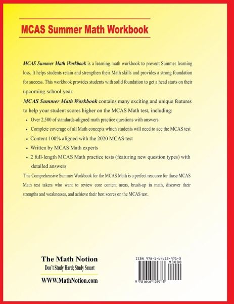 Prepare for the MCAS Math test with a perfect workbook! MCAS Summer Math Workbook is a learning math workbook to prevent Summer learning loss. It helps students retain and strengthen their Math skills and provides a strong foundation for success. This workbook provides students with solid foundation to get a head starts on their upcoming school year. MCAS Summer Math Workbook is designed by top test prep experts to help students prepare for the MCAS Math test. It provides test-takers with an in-depth focus on the math section of the test, helping them master the essential math skills that test-takers find the most troublesome. This is a prestigious resource for those who need an extra practice to succeed on the MCAS Math test in the summer. MCAS Summer Math Workbook contains many exciting and unique features to help your student scores higher on the MCAS Math test, including: * Over 2,500 of standards-aligned math practice questions with answers * Complete coverage of all Math concepts which students will need to ace the MCAS test * Content 100% aligned with the latest MCAS test * Written by MCAS Math experts * 2 full-length MCAS Math practice tests (featuring new question types) with detailed answers This Comprehensive Summer Workbook for the MCAS Math is a perfect resource for those MCAS Math test takers who want to review core content areas, brush-up in math, discover their strengths and weaknesses, and achieve their best scores on the MCAS test. Published By: The Math Notion www.mathnotion.com