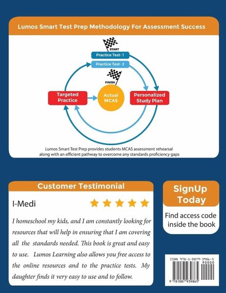 Massachusetts Comprehensive Assessment System (MCAS) 7th Grade English Language Arts Workbook for Kids (Ages 12-13) updated for 2025-26. Boost your child's MCAS test scores using the Lumos Grade 7 English language Arts Test Prep Workbook. Crafted by expert educators, this workbook comprehensively covers over 40+ essential ELA skills tailored for seventh graders. Featuring a wide variety of standards-aligned practice questions, the Lumos MCAS workbook supports your child to enhance ELA proficiency through consistent daily and weekly practice, resulting in improved MCAS test scores. Why You'll Love This 7th Grade English Book for 2025-26 MCAS Test PrepExcel in 40+ Essential ELA Skills: Master key ELA concepts including Reading: Literature, Reading: Informational Text, and Language. This comprehensive workbook fosters not just success in the Massachusetts State assessment, but also cultivates a robust academic groundwork. Boost State Test Success: Lumos MCAS test prep workbooks break free from traditional print workbooks. It features a wide variety of standards-aligned content in both print and online formats. Lumos Smart Test Prep Methodology: Unlock success on the Massachusetts State test (MCAS) powered by our proprietary Lumos Smart Test Prep Methodology. It provides simulated MCAS practice and remediation tools to overcome proficiency gaps. Replicated MCAS Practice: Access 2 full-length online practice tests mirroring the MCAS blueprint-question types, tech-enhanced items, duration, rigor of the standards, and more. Plus, the look and feel are the same as the actual MCAS computerized test, fostering comfort with the MCAS format, and boosting test readiness. Important Note: Once you register for the online program, the first practice test gets auto-assigned by Lumos Support.Targeted Auto-remediation Powered by AI: Based on your child's performance on the online MCAS-like practice tests, the program uses AI to automatically assign personalized remedial practice assignments to address specific skill gaps. Track Your Child's Progress and Growth: Gain valuable insights with an intuitive dashboard in the online program to monitor advancement and pinpoint strong and weak areas. About Lumos Learning Lumos Learning has been a trusted partner in providing state test preparation resources to parents and educators for over 16 years. With an impressive reach of over 1 million students, 125,000 teachers, and 44,000 schools, our proven study programs improve student outcomes in state assessments. Versatile and Flexible Learning SolutionAt-Home Learning Classroom Learning Home Tutoring & Home Schooling. Resources in the Print Workbook3 chapters covering 40+ ELA skills Answer keys with detailed explanations Resources in the Online Program2 full-length practice tests mirroring the MCAS blueprint AI-driven targeted auto-remediation to address skill gaps Supplementary resources: solved examples, videos, and more User-friendly dashboard and performance reports for progress measurement Access MCAS Online Resources in 3 Easy StepsScan the QR code or visit www.lumoslearning.com/a/tedbooks Enter the access code provided within the print workbook Provide basic details and get started! Grab your copy of the Lumos MCAS 7th-grade English Language Arts workbook today and boost your child's Massachusetts State test scores!
