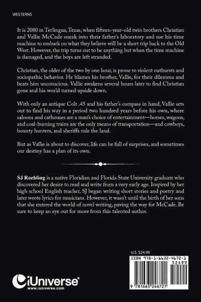 It is 2080 in Terlingua, Texas, when fifteen-year-old twin brothers Christian and Vallie McCade sneak into their father's laboratory and use his time machine to embark on what they believe will be a short trip back to the Old West. However, the trip turns out to be anything but when the time machine is damaged, and the boys are left stranded. Christian, the older of the two by one hour, is prone to violent outbursts and sociopathic behavior. He blames his brother, Vallie, for their dilemma and beats him unconscious. Vallie awakens several hours later to find Christian gone and his world turned upside down. With only an antique Colt .45 and his father's compass in hand, Vallie sets out to find his way in a period two hundred years before his own, where saloons and cathouses are a man's choice of entertainment-horses, wagons, and coal-burning trains are the only means of transportation-and cowboys, bounty hunters, and sheriff's rule the land. But as Vallie is about to discover, life can be full of surprises, and sometimes our destiny has a plan of its own.