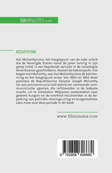 Het McCarthyisme, het hoogtepunt van de rode schrik die de Verenigde Staten vanaf de jaren twintig in zijn greep hield, is een bepalende episode in de naoorlogse Amerikaanse geschiedenis. Hoewel de heksenjacht niet begon met McCarthy, was het McCarthyisme de belichaming en het hoogtepunt ervan. Van 1950 tot 1954 dreef paranoia de Republikeinse Senator Joseph McCarthy tot een anticommunistisch beleid om vermeende communistische agenten, die infiltreerden in de federale macht, uit te schakelen. Miljoenen onderzoeken naar gewone burgers en de overheid resulteerden in de beperking van politieke meningsuiting en burgerrechten. Lees meer over deze periode in dit boek.