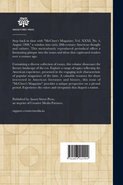 Step back in time with "McClure's Magazine, Vol. XXXI, No. 4, August 1908," a window into early 20th-century American thought and culture. This meticulously reproduced periodical offers a fascinating glimpse into the issues and ideas that captivated readers over a century ago. Containing a diverse collection of essays, this volume showcases the literary landscape of the era. Explore a range of topics reflecting the American experience, presented in the engaging style characteristic of popular magazines of the time. A valuable resource for those interested in American literature and history, this issue of "McClure's Magazine" provides a unique perspective on a pivotal period. Experience the voices and viewpoints that shaped a nation. This work has been selected by scholars as being culturally important, and is part of the knowledge base of civilization as we know it. This work is in the public domain in the United States of America, and possibly other nations. Within the United States, you may freely copy and distribute this work, as no entity (individual or corporate) has a copyright on the body of the work. Scholars believe, and we concur, that this work is important enough to be preserved, reproduced, and made generally available to the public. We appreciate your support of the preservation process, and thank you for being an important part of keeping this knowledge alive and relevant.
