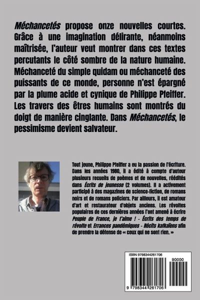 Méchancetés propose onze nouvelles courtes. Grâce à une imagination délirante, néanmoins maîtrisée, l'auteur veut montrer dans ces textes percutants le côté sombre de la nature humaine. Méchanceté du simple quidam ou méchanceté des puissants de ce monde, personne n'est épargné par la plume acide et cynique de Philippe Pfeiffer. Les travers des êtres humains sont montrés du doigt de manière cinglante. Dans Méchancetés, le pessimisme devient salvateur.