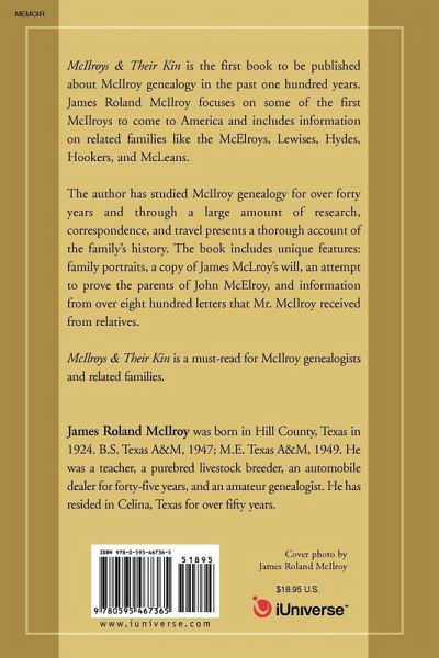 McIlroys & Their Kin is the first book to be published about McIlroy genealogy in the past one hundred years. James Roland McIlroy focuses on some of the first McIlroys to come to America and includes information on related families like the McElroys, Lewises, Hydes, Hookers, and McLeans. The author has studied McIlroy genealogy for over forty years and through a large amount of research, correspondence, and travel presents a thorough account of the family's history. The book includes unique features: family portraits, a copy of James McLroy's will, an attempt to prove the parents of John McElroy, and information from over eight thousand letters that Mr. McIlroy received from relatives. McIlroys & Their Kin is a must-read for McIlroy genealogists and related families.