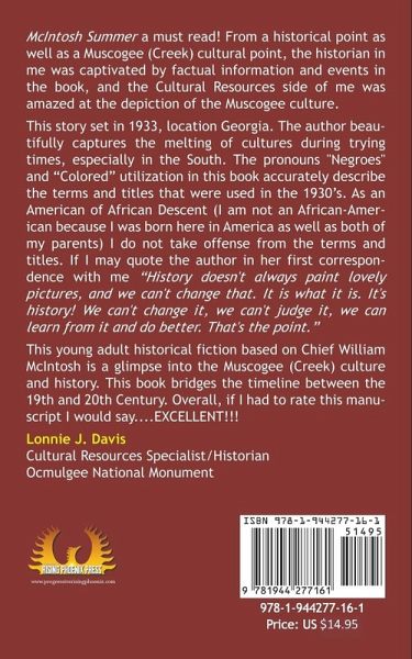 McIntosh Summer is set in 1933, location Georgia. This young adult historical fiction based on Chief William McIntosh is a glimpse into the Muscogee (Creek) culture and history. This book bridges the timeline between the 19th and 20th Century, and it captures the melting of cultures during trying times, especially in the South. The pronouns "Negroes" and "Colored" utilization in this book accurately describe the terms and titles that were used in the 1930's. History doesn't always paint lovely pictures, and we can't change that. It is what it is. It's history! We can't change it, we can't judge it, we can learn from it and do better. That's the point.…mehr