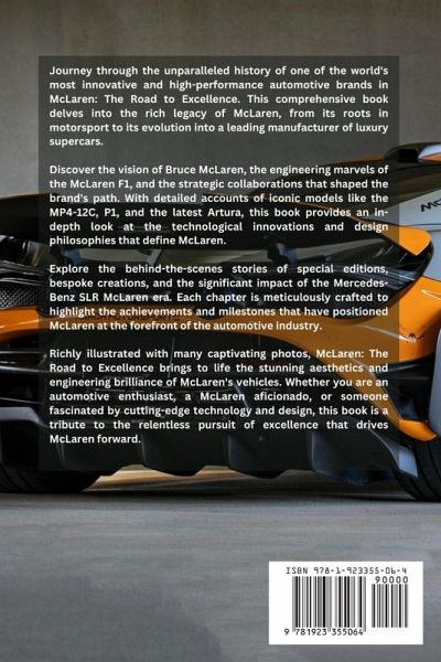 Journey through the unparalleled history of one of the world's most innovative and high-performance automotive brands in McLaren: The Road to Excellence. This comprehensive book delves into the rich legacy of McLaren, from its roots in motorsport to its evolution into a leading manufacturer of luxury supercars. Discover the vision of Bruce McLaren, the engineering marvels of the McLaren F1, and the strategic collaborations that shaped the brand's path. With detailed accounts of iconic models like the MP4-12C, P1, and the latest Artura, this book provides an in-depth look at the technological innovations and design philosophies that define McLaren. Explore the behind-the-scenes stories of special editions, bespoke creations, and the significant impact of the Mercedes-Benz SLR McLaren era. Each chapter is meticulously crafted to highlight the achievements and milestones that have positioned McLaren at the forefront of the automotive industry. Richly illustrated with many captivating photos, McLaren: The Road to Excellence brings to life the stunning aesthetics and engineering brilliance of McLaren's vehicles. Whether you are an automotive enthusiast, a McLaren aficionado, or someone fascinated by cutting-edge technology and design, this book is a tribute to the relentless pursuit of excellence that drives McLaren forward.