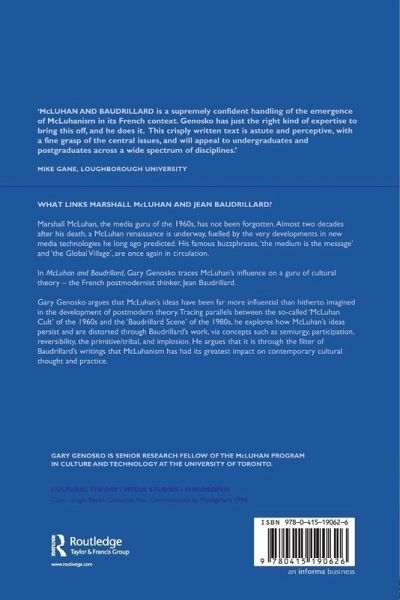 Marshall McLuhan, the media guru of the 1960s, has not been forgotten. Almost two decades after his death, a McLuhan renaissance is underway, fuelled by the very developments in new media technologies he long ago predicted. His famous buzzphrases, the medium is the message and the global village, are once again in circulation. In McLuhan and Baudrillard, Gary Genosko traces McLuhans influence on a guru of cultural theory - the French postmodernist thinker, Jean Baudrillard. Gary Genosko argues that McLuhans ideas have been far more influential than hitherto imagined in the development of postmodern theory. Tracing parallels between the so-called McLuhan Cult of the 1960s and the Baudrillard Scene of the 1980s, he explores how McLuhans ideas persist and are distorted through Baudrillards work, via concepts such as semiurgy, participation, reversibility, the primitive/tribal, and implosion. He argues that it is through Baudrillad's influence that McLuhanism has had its greatest impact on contemporary cultural thought and practice.