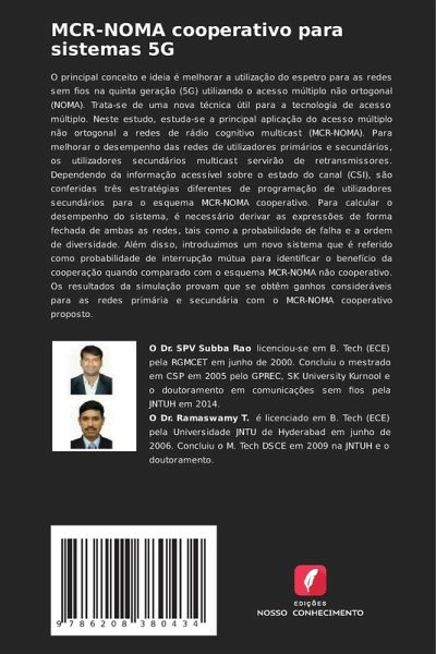 O principal conceito e ideia é melhorar a utilização do espetro para as redes sem fios na quinta geração (5G) utilizando o acesso múltiplo não ortogonal (NOMA). Trata-se de uma nova técnica útil para a tecnologia de acesso múltiplo. Neste estudo, estuda-se a principal aplicação do acesso múltiplo não ortogonal a redes de rádio cognitivo multicast (MCR-NOMA). Para melhorar o desempenho das redes de utilizadores primários e secundários, os utilizadores secundários multicast servirão de retransmissores. Dependendo da informação acessível sobre o estado do canal (CSI), são conferidas três estratégias diferentes de programação de utilizadores secundários para o esquema MCR-NOMA cooperativo. Para calcular o desempenho do sistema, é necessário derivar as expressões de forma fechada de ambas as redes, tais como a probabilidade de falha e a ordem de diversidade. Além disso, introduzimos um novo sistema que é referido como probabilidade de interrupção mútua para identificar o benefício da cooperação quando comparado com o esquema MCR-NOMA não cooperativo. Os resultados da simulação provam que se obtêm ganhos consideráveis para as redes primária e secundária com o MCR-NOMA cooperativo proposto.