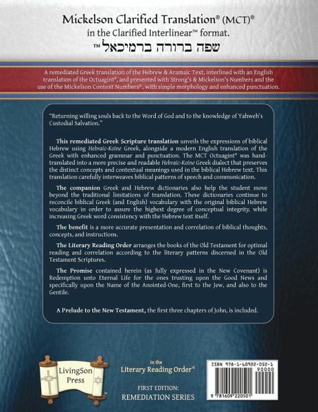 The MCT(R) Octuagint(R) in the Clarified Interlinear(TM) format. A remediated Greek translation of the Hebrew & Aramaic Text, interlined with an English translation of the Octuagint(R), and presented with Strong's & Mickelson's Numbers and the use of the Mickelson Context Numbers (c), with simple morphology and enhanced punctuation. * This remediated Greek Scripture translation unveils the expressions of biblical Hebrew using Hebraic-Koine Greek, alongside a modern English translation of the Greek with enhanced grammar and punctuation. The MCT Octuagint(R) was hand-translated into a more precise and readable Hebraic-Koine Greek dialect that preserves the distinct concepts and contextual meanings used in the biblical Hebrew text. This translation carefully interweaves biblical patterns of speech and communication. * The companion Greek and Hebrew dictionaries also help the student move beyond the traditional limitations of translation. These dictionaries continue to reconcile biblical Greek (and English) vocabulary with the original biblical Hebrew vocabulary in order to assure the highest degree of conceptual integrity, while increasing Greek word consistency with the Hebrew text itself. * The benefit is a more accurate presentation and correlation of biblical thoughts, concepts, and instructions. * The Literary Reading Order arranges the books of the Old Testament for optimal reading and correlation according to the literary patterns discerned in the Old Testament Scriptures. * The Promise contained herein (as fully expressed in the New Covenant) is Redemption unto Eternal Life for the ones trusting upon the Good News and specifically upon the Name of the Anointed-One, first to the Jew, and also to the Gentile. * A Prelude to the New Testament, the first three chapters of John, is included.