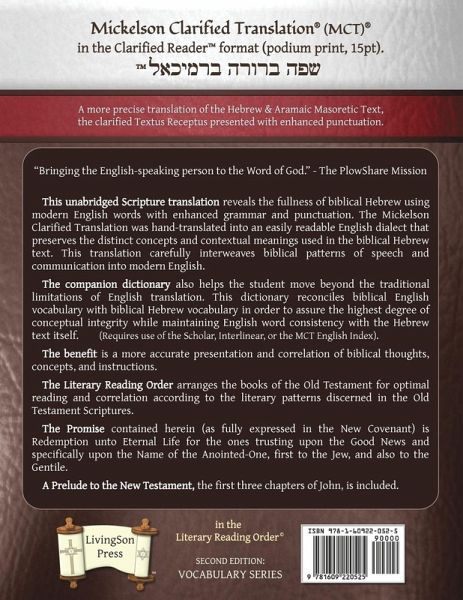 The Mickelson Clarified Translation (MCT)(R) in the Clarified Reader(TM) podium format (15pt). A more precise translation of the Hebrew and Aramaic Masoretic Text, the clarified Textus Receptus presented with enhanced punctuation. * This unabridged Scripture translation reveals the fullness of biblical Hebrew using modern English words with enhanced grammar and punctuation. The Mickelson Clarified Translation was hand-translated into an easily readable English dialect that preserves the distinct concepts and contextual meanings used in the biblical Hebrew text. This translation carefully interweaves biblical patterns of speech and communication into modern English. * The companion dictionary also helps the student move beyond the traditional limitations of English translation. This dictionary reconciles biblical English vocabulary with biblical Hebrew vocabulary in order to assure the highest degree of conceptual integrity while maintaining English word consistency with the Hebrew text itself. * The benefit is a more accurate presentation and correlation of biblical thoughts, concepts, and instructions. * The Literary Reading Order arranges the books of the Old Testament for optimal reading and correlation according to the literary patterns discerned in the Old Testament Scriptures. * The Promise contained herein (as fully expressed in the New Covenant) is Redemption unto Eternal Life for the ones trusting upon the Good News and specifically upon the Name of the Anointed-One, first to the Jew, and also to the Gentile. * A Prelude to the New Testament, the first three chapters of John, is included.