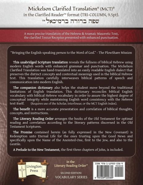 The Mickelson Clarified Translation (MCT)(R) in the Clarified Reader(TM) TRI-COLUMN format (9.5pt). A more precise translation of the Hebrew and Aramaic Masoretic Text, the clarified Textus Receptus presented with enhanced punctuation. * This unabridged Scripture translation reveals the fullness of biblical Hebrew using modern English words with enhanced grammar and punctuation. The Mickelson Clarified Translation was hand-translated into an easily readable English dialect that preserves the distinct concepts and contextual meanings used in the biblical Hebrew text. This translation carefully interweaves biblical patterns of speech and communication into modern English. * The companion dictionary also helps the student move beyond the traditional limitations of English translation. This dictionary reconciles biblical English vocabulary with biblical Hebrew vocabulary in order to assure the highest degree of conceptual integrity while maintaining English word consistency with the Hebrew text itself. * The benefit is a more accurate presentation and correlation of biblical thoughts, concepts, and instructions. * The Literary Reading Order arranges the books of the Old Testament for optimal reading and correlation according to the literary patterns discerned in the Old Testament Scriptures. * The Promise contained herein (as fully expressed in the New Covenant) is Redemption unto Eternal Life for the ones trusting upon the Good News and specifically upon the Name of the Anointed-One, first to the Jew, and also to the Gentile. * A Prelude to the New Testament, the first three chapters of John, is included.