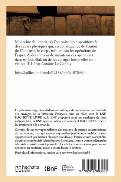 Médecine de l'esprit, où l'on traite des dispositions & des causes physiques qui, en conséquence de l'union de l'âme avec le corps, influent sur les opérations de l'esprit, & des moyens de maintenir ces opérations dans un bon état, ou de les corriger lorsqu'elles sont viciées. T.1 / par Antoine Le Camus Date de l'édition originale: 1753 Sujet de l'ouvrage: Comportement humain -- 18e siècle -- Ouvrages avant 1800Émotions -- 18e siècle -- Ouvrages avant 1800 Le présent ouvrage s'inscrit dans une politique de conservation patrimoniale des ouvrages de la littérature Française mise en place avec la BNF. HACHETTE LIVRE et la BNF proposent ainsi un catalogue de titres indisponibles, la BNF ayant numérisé ces oeuvres et HACHETTE LIVRE les imprimant à la demande. Certains de ces ouvrages reflètent des courants de pensée caractéristiques de leur époque, mais qui seraient aujourd'hui jugés condamnables. Ils n'en appartiennent pas moins à l'histoire des idées en France et sont susceptibles de présenter un intérêt scientifique ou historique. Le sens de notre démarche éditoriale consiste ainsi à permettre l'accès à ces oeuvres sans pour autant que nous en cautionnions en aucune façon le contenu. Pour plus d'informations, rendez-vous sur www.hachettebnf.fr