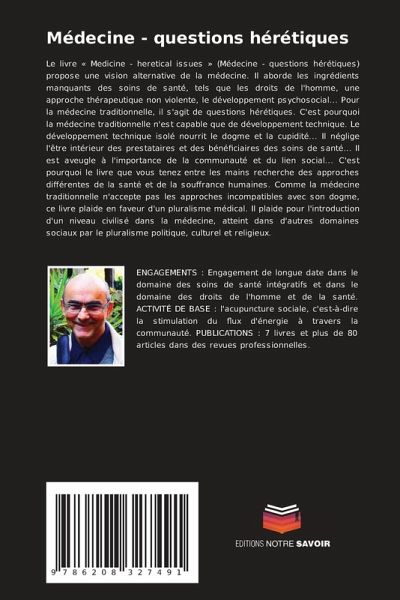 Le livre « Medicine - heretical issues » (Médecine - questions hérétiques) propose une vision alternative de la médecine. Il aborde les ingrédients manquants des soins de santé, tels que les droits de l'homme, une approche thérapeutique non violente, le développement psychosocial... Pour la médecine traditionnelle, il s'agit de questions hérétiques. C'est pourquoi la médecine traditionnelle n'est capable que de développement technique. Le développement technique isolé nourrit le dogme et la cupidité... Il néglige l'être intérieur des prestataires et des bénéficiaires des soins de santé... Il est aveugle à l'importance de la communauté et du lien social... C'est pourquoi le livre que vous tenez entre les mains recherche des approches différentes de la santé et de la souffrance humaines. Comme la médecine traditionnelle n'accepte pas les approches incompatibles avec son dogme, ce livre plaide en faveur d'un pluralisme médical. Il plaide pour l'introduction d'un niveau civilisé dans la médecine, atteint dans d'autres domaines sociaux par le pluralisme politique, culturel et religieux.