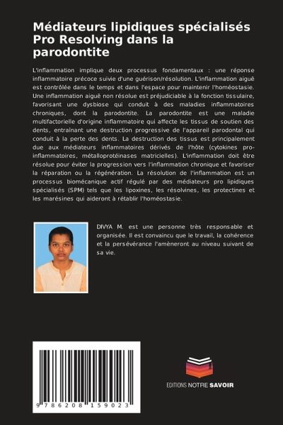 L'inflammation implique deux processus fondamentaux : une réponse inflammatoire précoce suivie d'une guérison/résolution. L'inflammation aiguë est contrôlée dans le temps et dans l'espace pour maintenir l'homéostasie. Une inflammation aiguë non résolue est préjudiciable à la fonction tissulaire, favorisant une dysbiose qui conduit à des maladies inflammatoires chroniques, dont la parodontite. La parodontite est une maladie multifactorielle d'origine inflammatoire qui affecte les tissus de soutien des dents, entraînant une destruction progressive de l'appareil parodontal qui conduit à la perte des dents. La destruction des tissus est principalement due aux médiateurs inflammatoires dérivés de l'hôte (cytokines pro-inflammatoires, métalloprotéinases matricielles). L'inflammation doit être résolue pour éviter la progression vers l'inflammation chronique et favoriser la réparation ou la régénération. La résolution de l'inflammation est un processus biomécanique actif régulé par des médiateurs pro lipidiques spécialisés (SPM) tels que les lipoxines, les résolvines, les protectines et les marésines qui aideront à rétablir l'homéostasie.