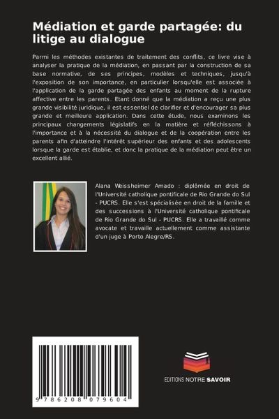 Parmi les méthodes existantes de traitement des conflits, ce livre vise à analyser la pratique de la médiation, en passant par la construction de sa base normative, de ses principes, modèles et techniques, jusqu'à l'exposition de son importance, en particulier lorsqu'elle est associée à l'application de la garde partagée des enfants au moment de la rupture affective entre les parents. Etant donné que la médiation a reçu une plus grande visibilité juridique, il est essentiel de clarifier et d'encourager sa plus grande et meilleure application. Dans cette étude, nous examinons les principaux changements législatifs en la matière et réfléchissons à l'importance et à la nécessité du dialogue et de la coopération entre les parents afin d'atteindre l'intérêt supérieur des enfants et des adolescents lorsque la garde est établie, et donc la pratique de la médiation peut être un excellent allié.