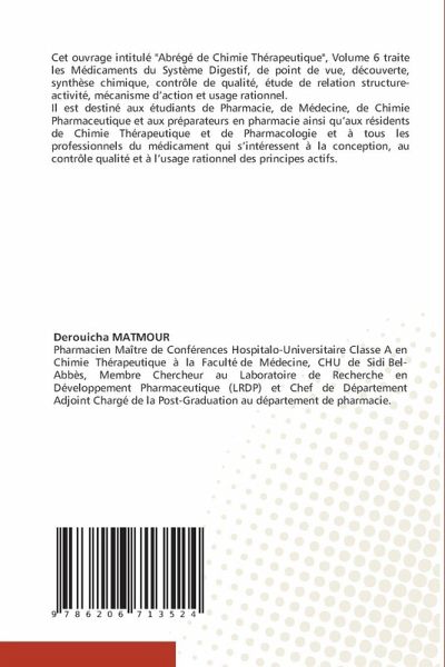 Cet ouvrage intitulé "Abrégé de Chimie Thérapeutique", Volume 6 traite les Médicaments du Système Digestif, de point de vue, découverte, synthèse chimique, contrôle de qualité, étude de relation structure-activité, mécanisme d'action et usage rationnel. Il est destiné aux étudiants de Pharmacie, de Médecine, de Chimie Pharmaceutique et aux préparateurs en pharmacie ainsi qu'aux résidents de Chimie Thérapeutique et de Pharmacologie et à tous les professionnels du médicament qui s'intéressent à la conception, au contrôle qualité et à l'usage rationnel des principes actifs.