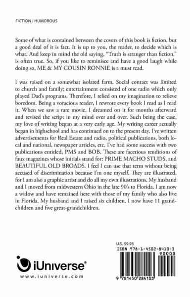 Some of what is contained between the covers of this book is fiction, but a good deal of it is fact. It is up to you, the reader, to decide which is what. And keep in mind the old saying, "Truth is stranger than fiction," is often true. So, if you like to reminisce and have a good laugh while doing so, ME & MY COUSIN RONNIE is a must read.