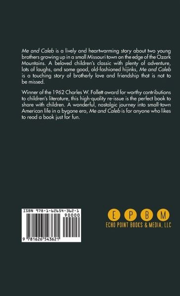 This book is also available from Echo Point Books in paperback (ISBN 1626543615). Me and Caleb is a lively and heartwarming story about two young brothers growing up in a small Missouri town on the edge of the Ozark Mountains. A beloved children's classic with plenty of adventure, lots of laughs, and some good, old-fashioned hijinks, Me and Caleb is a touching story of brotherly love and friendship that is not to be missed. Winner of the 1962 Charles W. Follett award for worthy contributions to children's literature, this high-quality re-issue is the perfect book to share with children. A wonderful, nostalgic journey into small-town American life in a bygone era, Me and Caleb is for anyone who likes to read a book just for fun.