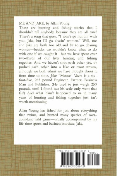 ME AND JAKE, by Allan Young. These are hunting and fishing stories that I shouldn't tell anybody, because they are all true! There's a song that goes: "I won't go huntin' with you, Jake, but I'll go chasin' women." Well, me and Jake are both too old and fat to go chasing women-besides we wouldn't know what to do with one if we caught it-but we have spent over two-thirds of our lives hunting and fishing together. And we haven't shot each other yet, or pushed each other into a lake or trout stream, although we both admit we have thought about it from time to time. Jake "Moose" Vavra is a six-foot-five, 265 pound Engineer, Farmer, Business Man and Publisher. (He used to just weigh 250 pounds, until I found out his scale only went that far!) And what hasn't happened to us in many years of hunting and fishing together just isn't worth mentioning.