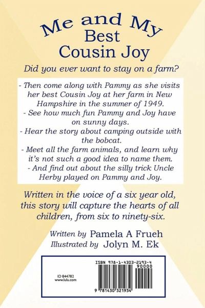 Did you ever want to stay on a farm? Then come along with Pammy as she visits her Best Cousin Joy at her farm in New Hampshire in the summer of 1949. See how much fun Pammy and Joy have on sunny days. Hear the story about camping outside with the bobcat. Meet all the farm animals, and learn why it's not such a good idea to name them. And find out about the silly trick Uncle Herby played on Pammy and Joy. Written in the voice of a six year old, this story will capture the hearts of all children, from six to ninety-six.