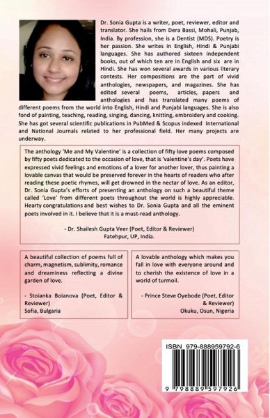 The anthology 'Me and My Valentine' compiled and edited by Dr. Sonia Gupta, is a collection of fifty love poems composed by fifty poets dedicated to the occasion of love, that is 'valentine's day'. Poets have expressed vivid feelings and emotions of a lover for another lover, thus painting a lovable canvas that would be preserved forever in the hearts of readers who after reading these poetic rhymes, will get drowned in the nectar of love.