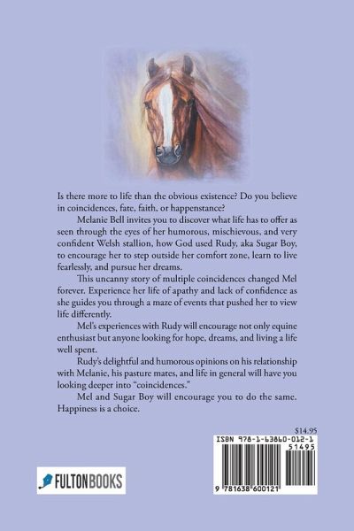Is there more to life than the obvious existence? Do you believe in coincidences, fate, faith, or happenstance? Melanie Bell invites you to discover what life has to offer as seen through the eyes of her humorous, mischievous, and very confident Welsh stallion, how God used Rudy, aka Sugar Boy, to encourage her to step outside her comfort zone, learn to live fearlessly, and pursue her dreams. This uncanny story of multiple coincidences changed Mel forever. Experience her life of apathy and lack of confidence as she guides you through a maze of events that pushed her to view life differently. Mel's experiences with Rudy will encourage not only equine enthusiast but anyone looking for hope, dreams, and living a life well spent. Rudy's delightful and humorous opinions on his relationship with Melanie, his pasture mates, and life in general will have you looking deeper into "coincidences." Mel and Sugar Boy will encourage you to do the same. Happiness is a choice.