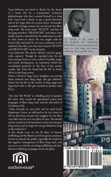 Lucas Johnson was lured to Russia for the hopes of a better life, by a community?s acclaimed philanthropist who later revealed himself as a drug lord. Lucas had a dream to get a good education and to live large when he returns home. Eventually, stranded in foreign country, he was led into the illicit drug trade. His street name ?BUDDY? and that of his gang members ?HEADACHE? and others were hardly related or identified by the authorities in order to close down on them. He was caught with his friend Zulu and jailed for six years, unknown to the authority that they were the most wanted ?BUDDY and HEADACHE? on the drug list. Lucas Johnson! His phony identity and his gangs? styles exposed. Though he repented after his jail term and got home to run a school of public image and youth development, an institution which has contributed positively in the lives of his society youths. But Zulu his friend lost his life in South Africa in the drug course. Mario a friend to Inga, Lucas? daughter, was among those initiated into drug usage and got addicted. Mario lost his life in the course of drug usage and Inga lived with it. She got married to another man Emry. ?Me And The World? is a thrilling story of people?s life styles, that reveals the operational norms and languages of illicit drug trade and the aftermath of it in human life. ?Zulu, honestly we were bad, and we need God?s forgiveness. Listen, we still need to be very smart in all our directions, because the maggots we met then may still come for us at any place or time. You should not be carried away by luxurious events now, because drug terrors and revenges do not get deleted as long as the mafias live.? It also details more on the ill effect of human trafficking and the illusive search for greener pastures. It aims to educate the public, especially the youth on the negative consequences of illicit drug trade, and can serve as a tool for anti-drug trafficking and anti-human trafficking campaigns across the globe. **************