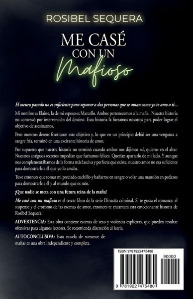 El oscuro pasado no es suficiente para separar a dos personas que se aman como yo te amo a ti... Mi nombre es Elaine, la de mi esposo es Marcello. Ambos pertenecemos a la mafia. Nuestra historia no comenzó por intervención del destino. Esta historia la forzamos nosotros para poder lograr el objetivo de asesinarnos. Pero nuestros deseos frustraron este objetivo y, lo que en un principio debió ser una venganza a sangre fría, terminó en una excitante historia de amor. Por supuesto que nuestra historia no terminó cuando ambos nos dijimos sí, quiero en el altar. Nuestros antiguos secretos impedían que fuéramos felices. Querían apartarlo de mi lado. Y aunque nos complementábamos de la forma más lasciva y perfecta que existe, nuestro amor no era suficiente para demostrarle a él que yo lo amaba. Tuve entonces que tomar mi preciado cuchillo y bañarme en sangre o volar una mansión en pedazos para demostrarle a él y al mundo que es mío. ¡Que nadie se meta con una futura reina de la mafia! Me casé con un mafioso es el tercer libro de la serie Dinastía criminal. Si te gusta el romance, el suspense y el erotismo de las escenas de amor, entonces te encantará esta emocionante historia de Rosibel Sequera. ADVERTENCIA: Esta obra contiene escenas de sexo y violencia explícitas, que pueden resultar ofensivas para algunos lectores. Se recomienda discreción al leerla. AUTOCONCLUSIVA: Esta novela de romance de mafias es una obra independiente y completa.