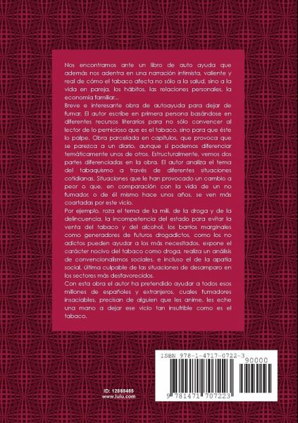 SINOPSIS Me acabo de despertar y me encuentro tumbado en la cama de un hospital. Después de varias pruebas me han diagnosticado enfisema pulmonar y cáncer de pulmón. Los médicos dicen que el enfisema pulmonar puede curarse dejando de fumar, pero el cáncer esta muy avanzado y no me dan muchas esperanzas de vida, meses, incluso días. Escribo este libro sin saber si voy a terminarlo pues mi estado es bastante crítico, pero con la esperanza de que algún día sirva a alguien para dejar de fumar. NUNCA ES TARDE CUANDO LA DICHA ES BUENA, en mi caso ya es tarde no hay remedio y me estoy muriendo. Ahora me acuerdo la primera vez que me puse la muerte en los labios... ME ESTOY MURIENDO es parte de la vida de cualquier fumador, es el sinvivir de todos los días de un adicto a la nicotina que quiere dejar de fumar para siempre, pero cuando se da cuenta ya es demasiado tarde. Es la historia que demuestra que a veces las pesadillas se convierten en realidad.