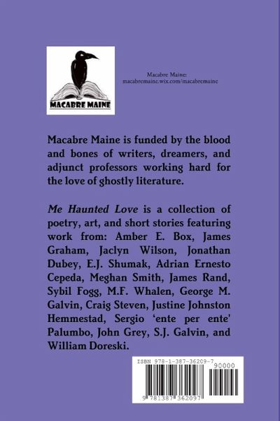 Me Haunted Love is a collection of poetry, art, and short stories featuring work from: Amber E. Box, James Graham, Jaclyn Wilson, Jonathan Dubey, E.J. Shumak, Adrian Ernesto Cepeda, Meghan Smith, James Rand, Sybil Fogg, M.F. Whalen,George M. Galvin, Craig Steven, Justine Johnston Hemmestad, Sergio 'ente per ente' Palumbo, JohnGrey, S.J. Galvin, and William Doreski.