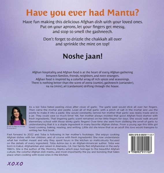 Me, Mommy, Mantu by Toba Adina-Jao is a heartwarming children's book that celebrates Afghan culture through the cherished tradition of making mantu, a flavorful Afghan dumpling. The story highlights the joy of cooking together with family, while also offering a special mantu recipe at the end for readers to try.