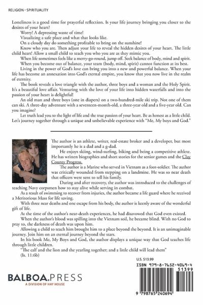 Loneliness is a good time for prayerful reflection. Is your life journey bringing you closer to the desires of your heart? Worry! A depressing waste of time! Visualizing a safe place and what that looks like. On a cloudy day do something profitable to bring on the sunshine! Know who you are. Then adjust your life to reveal the hidden desires of your heart. The little child heart! Allow a small child to teach you who you are as they mimic you. When life sometimes feels like a merry-go-round, jump off. Seek balance of body, mind and spirit. When you become out of balance, your team (body, mind, spirit) cannot function at its best. Living in the power of God's love can bring you into a new and powerful balance. When your life has become an annexation into God's eternal empire, you know that you now live in the realm of eternity. The book reveals a love triangle with the author, three boys and a woman and the Holy Spirit. It's a beautiful love affair. Venturing with the love of your life into hidden waterfalls and into the passion of your heart is delightful! An old man and three boys (one in diapers) on a two-hundred-mile ski trip. Not one of them can ski. A three-day adventure with a seventeen-month-old, a three-year old and a five-year old. Can you imagine? Let truth lead you to the light of life and the true passion of your heart. Be as honest as a little child. Let's journey together through a unique and unbelievable experience with "Me, My boys and God."