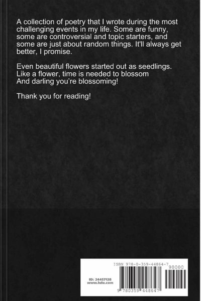 A collection of poetry that I wrote during my life. Some pieces represent hope, betrayal,friendship, nature, self growth, and love. I hope these pieces help whoever needs them. It gets better. Have faith. "Even beautiful flowers started out as seedlings. Like a flower, time is needed to blossom And darling you're blossoming"