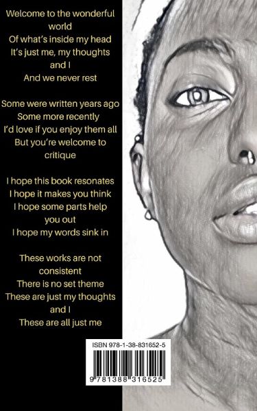 "Welcome to the wonderful world of what's inside my head." Me, My Thoughts and I is a collection of poems and random thoughts which gives an insight into Liz Kamille's feelings and opinions on a range of different topics. It gives a little inspiration here, a little motivation there, and also aims to show that we all go through some similar things!